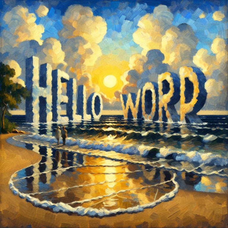 Impressionist-style painting capturing a creative visual representation of the words 'Hello World'. This scene features an idyllic seaside setting with the words 'Hello World' naturally integrated into the environment. The water reflects the luster of a setting sun, and oversized rippling letters arrive at the shore, forming the 'Hello'. In the distance, large clouds form the 'World'. The painting's ambiance is evocative of the charm and harmony typically found in the works of artists from the Impressionist era. The primary medium used for this painting is oil, with the characteristic thick, short brushstrokes of the style.