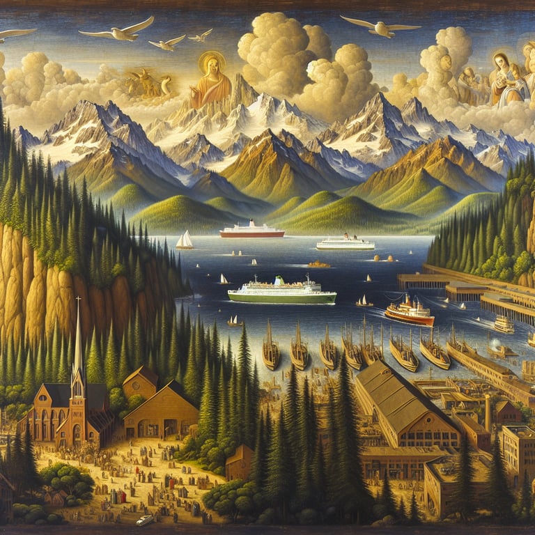 Create an early Renaissance style painting incorporating elements iconic to the Pacific Northwest and Seattle culture. Visualize lush evergreen forests, majestic mountains, and the vast ocean that characterizes the Pacific Northwest. Depict carefully the Seattle cityscape, including sights like the bustling Pike Place Market, the iconic ferries cruising across the water, and maybe a coffee shop—essentially representing the laidback urban lifestyle. Render in the detailed, naturalistic and religious themes characteristic of early Renaissance art using tempera on wood panel. The scene should have a harmonious blend of nature, architecture, and city life.