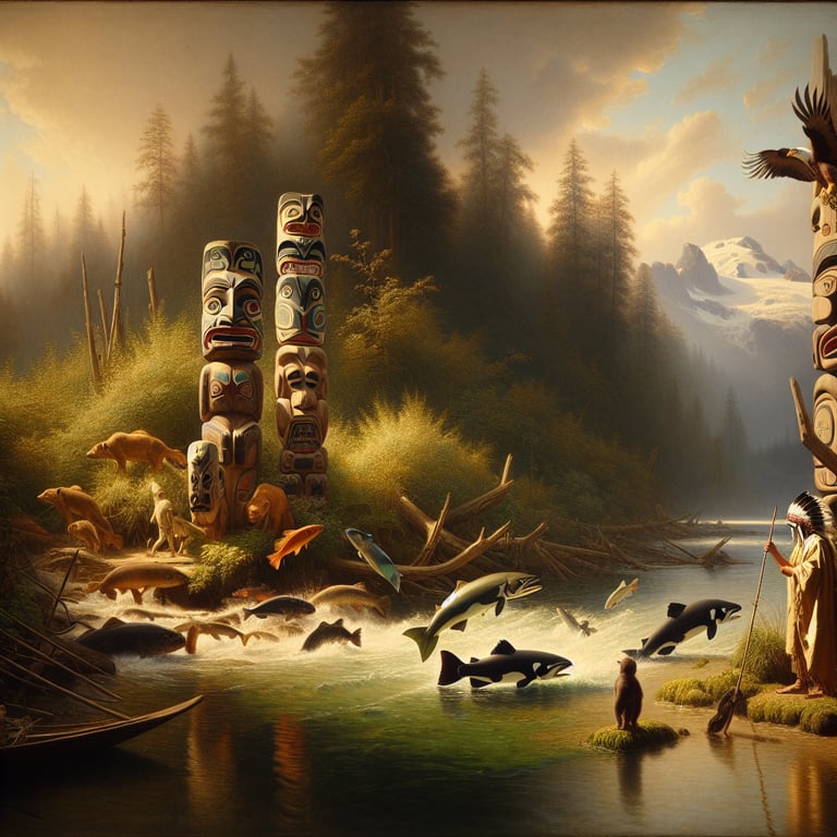 Create an artwork reminiscent of the Renaissance painting style, but influenced by Pacific Northwest culture. The image should contain classical natural elements combined with distinct features of the Pacific Northwest, such as the region’s lush greenery, fish, wildlife, totem poles, and Native American artistry. The lighting should have a clear influence from the Renaissance, with defined shadows and highlights, and the color palette should be earth-toned with occasional bright accents common in Native American art. The scene can include human figures in the style of Renaissance artworks, clothed with traditional Pacific Northwest Native American attire.